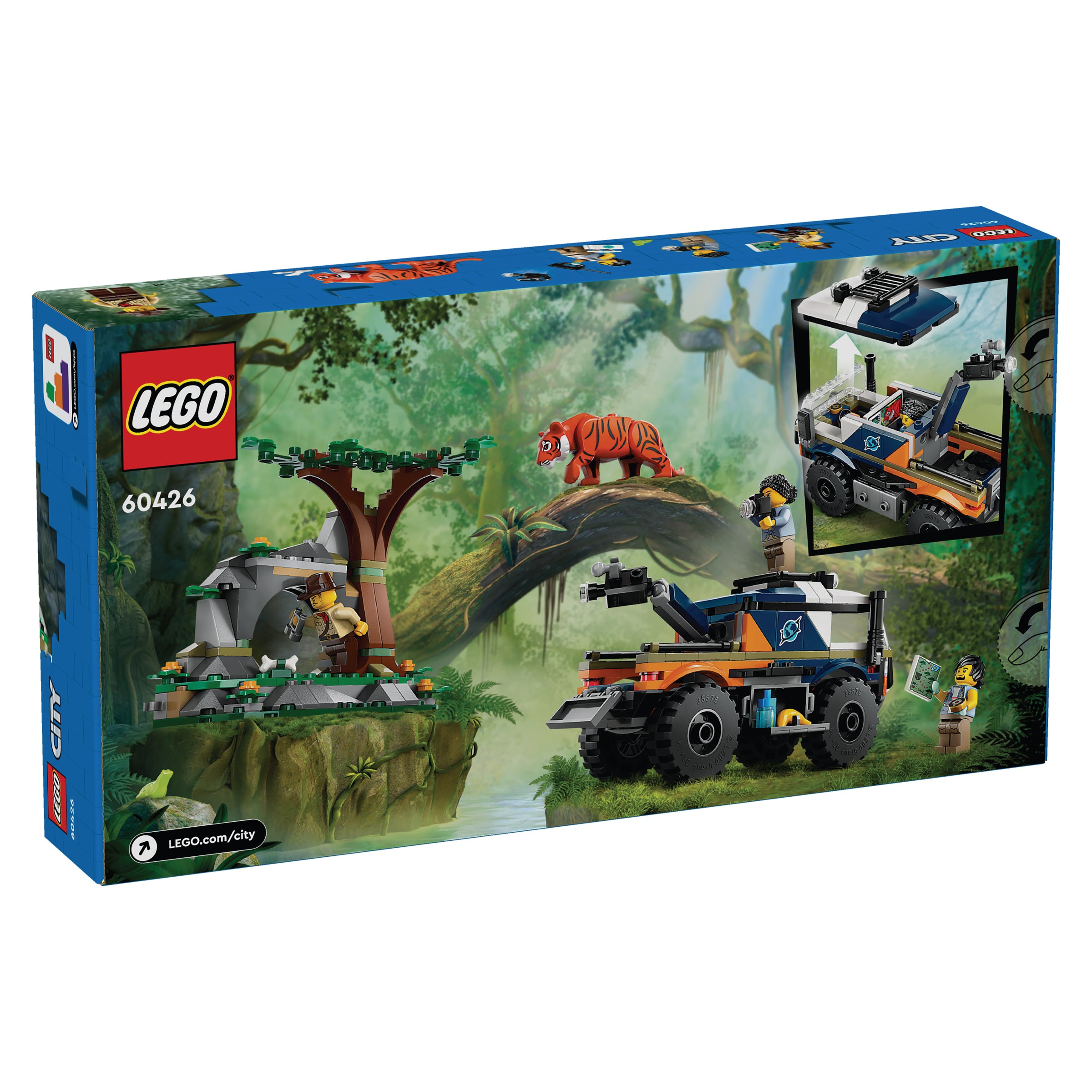 Fuel your child's spirit of adventure with the LEGO City Jungle Explorer Off-Road Truck toy building set (60426) for ages 6 and up This cool toy truck with rugged tires and a movable camera boom will whisk your young explorer to the heart of the jungle for epic tiger-safari adventures The set also includes a jungle cave setting toy drone 3 explorer minifigures and a tiger figure for storytelling and imaginative play